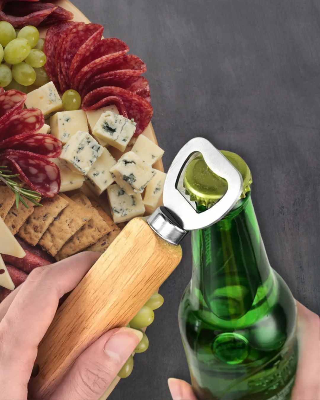 • Material: Wooden handle with stainless-steel opener