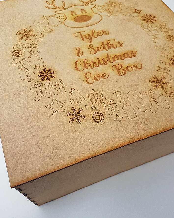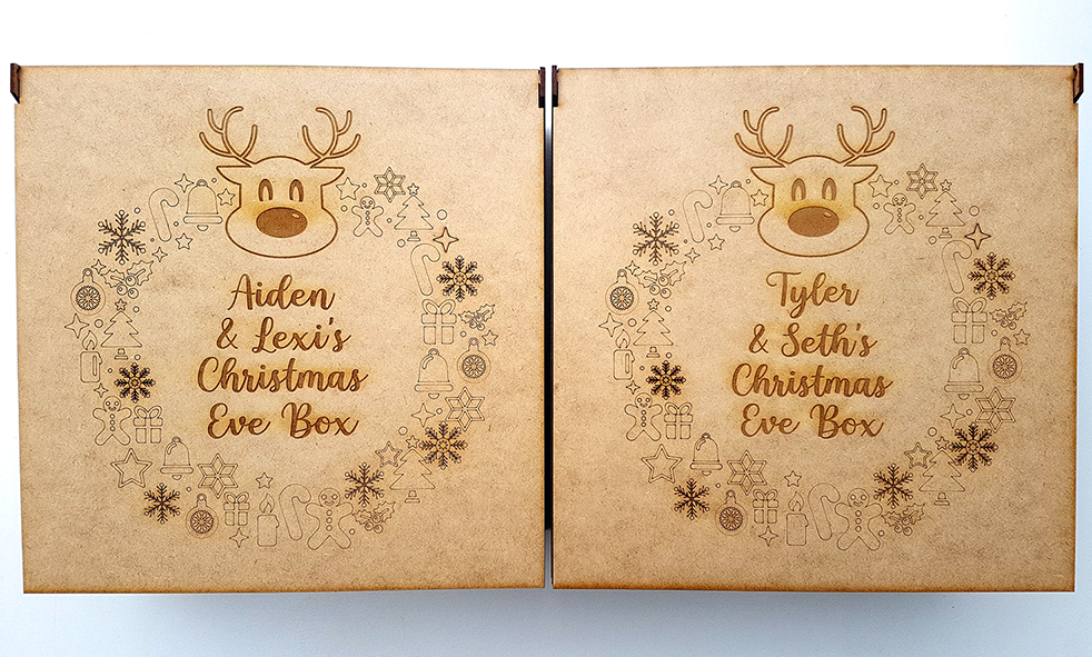 Each box is laser-engraved with your chosen names, ready to fill with all the little surprises that make the night before Christmas unforgettable — new pyjamas, snacks, a Christmas movie, or a letter from Santa.